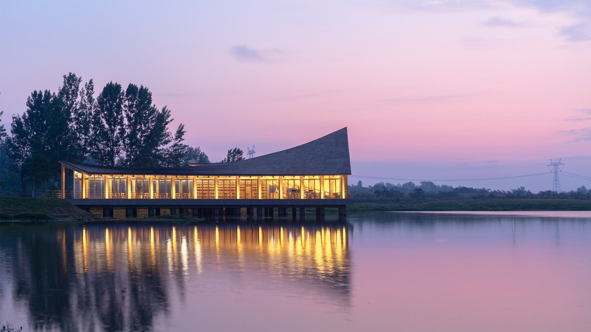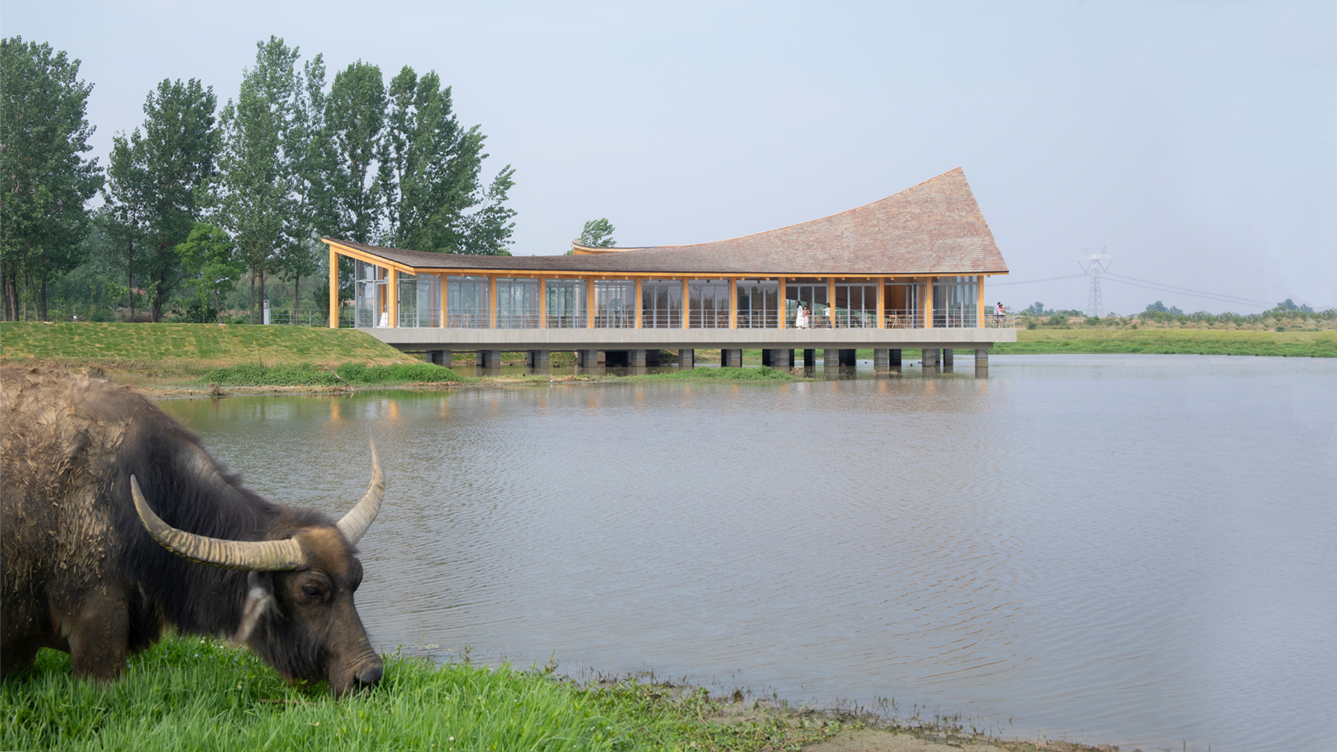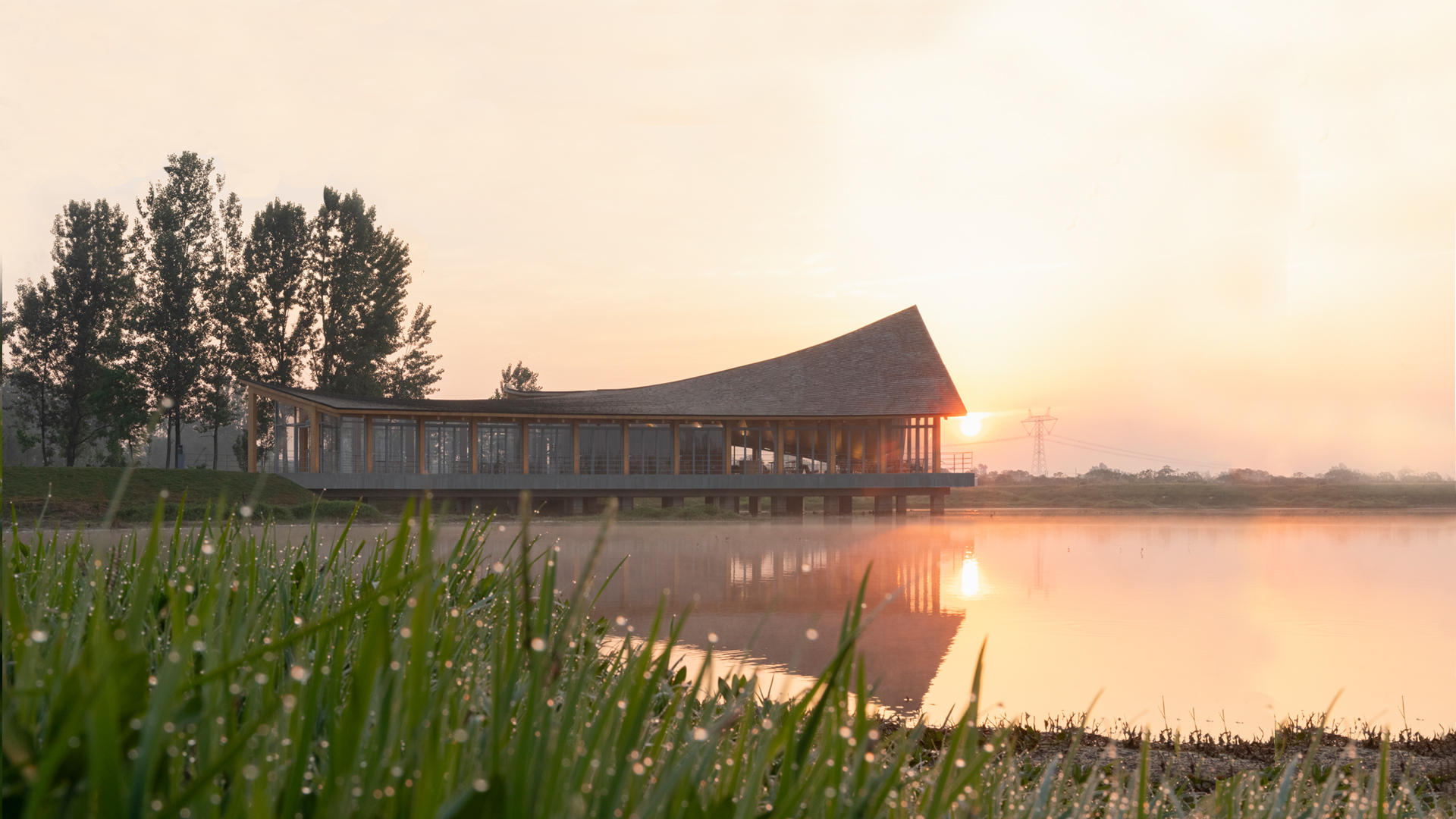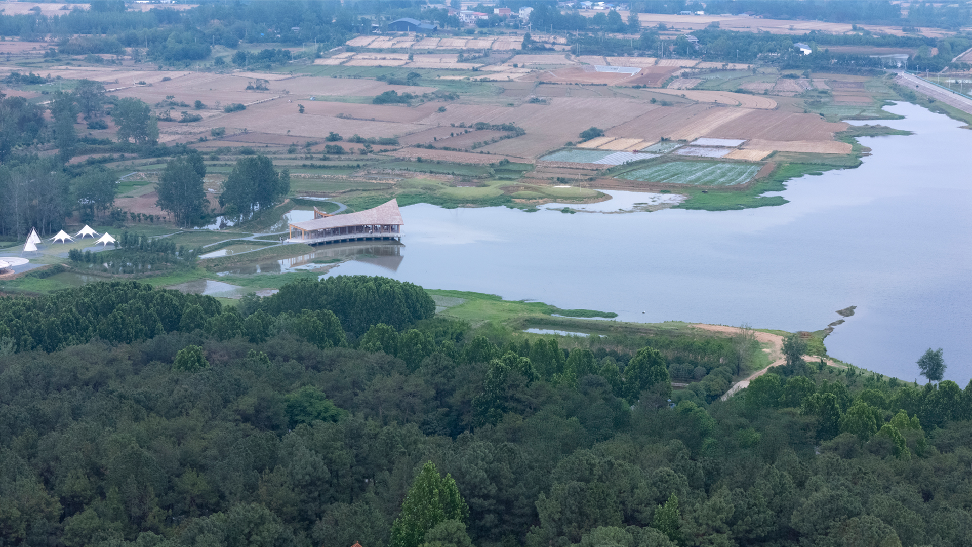 项目所在水库承担着周边农田灌溉功能,水位随季节变化。考虑到水库周边丰富的水鸟栖息环境,设计采用环境敏感型生成逻辑:通过数字化地形分析,使建筑既融入原生堤埂肌理中,又通过抬升基座适应水位波动。原生植物系统被保留为生态缓冲带,形成建筑与水域的有机过渡。