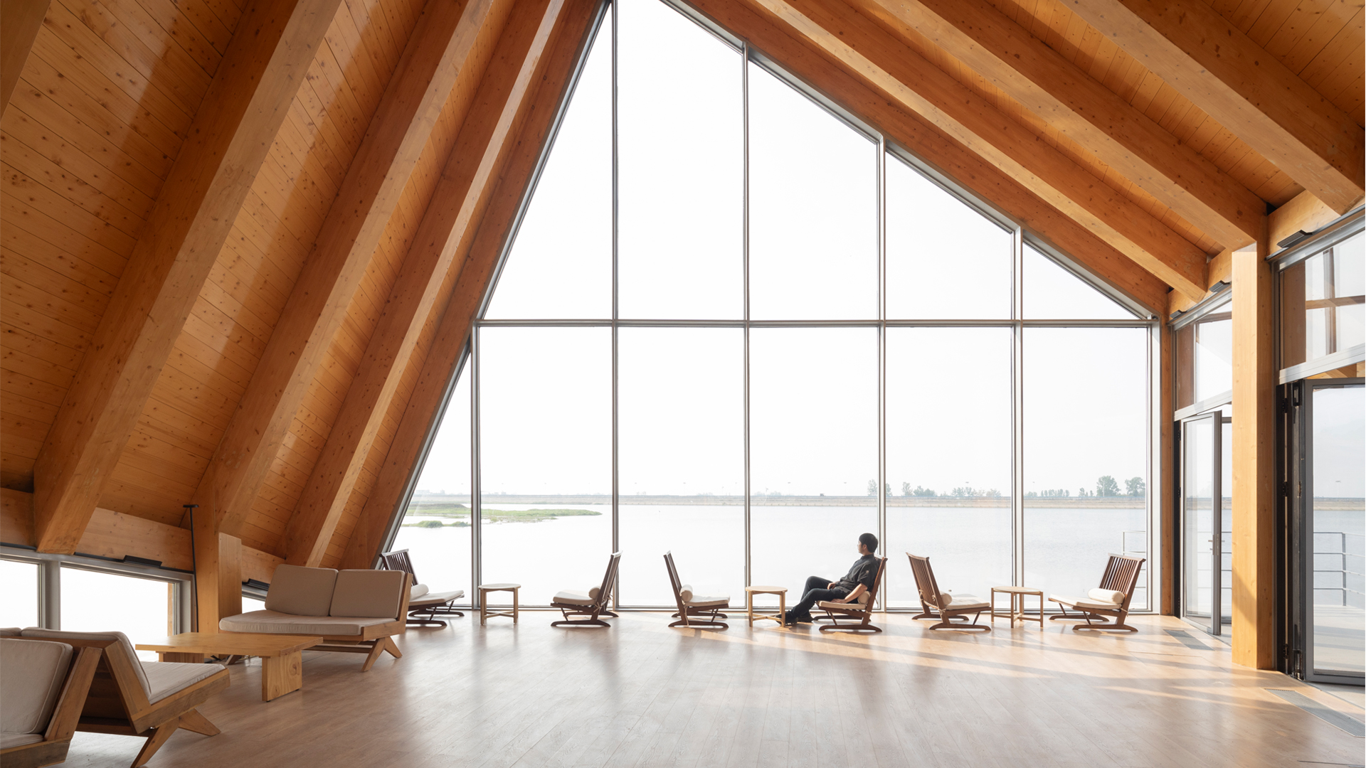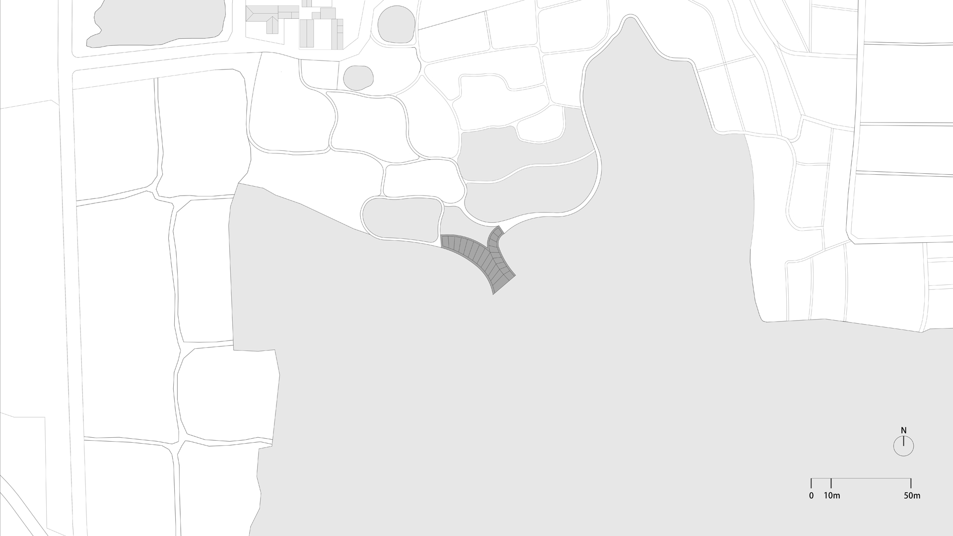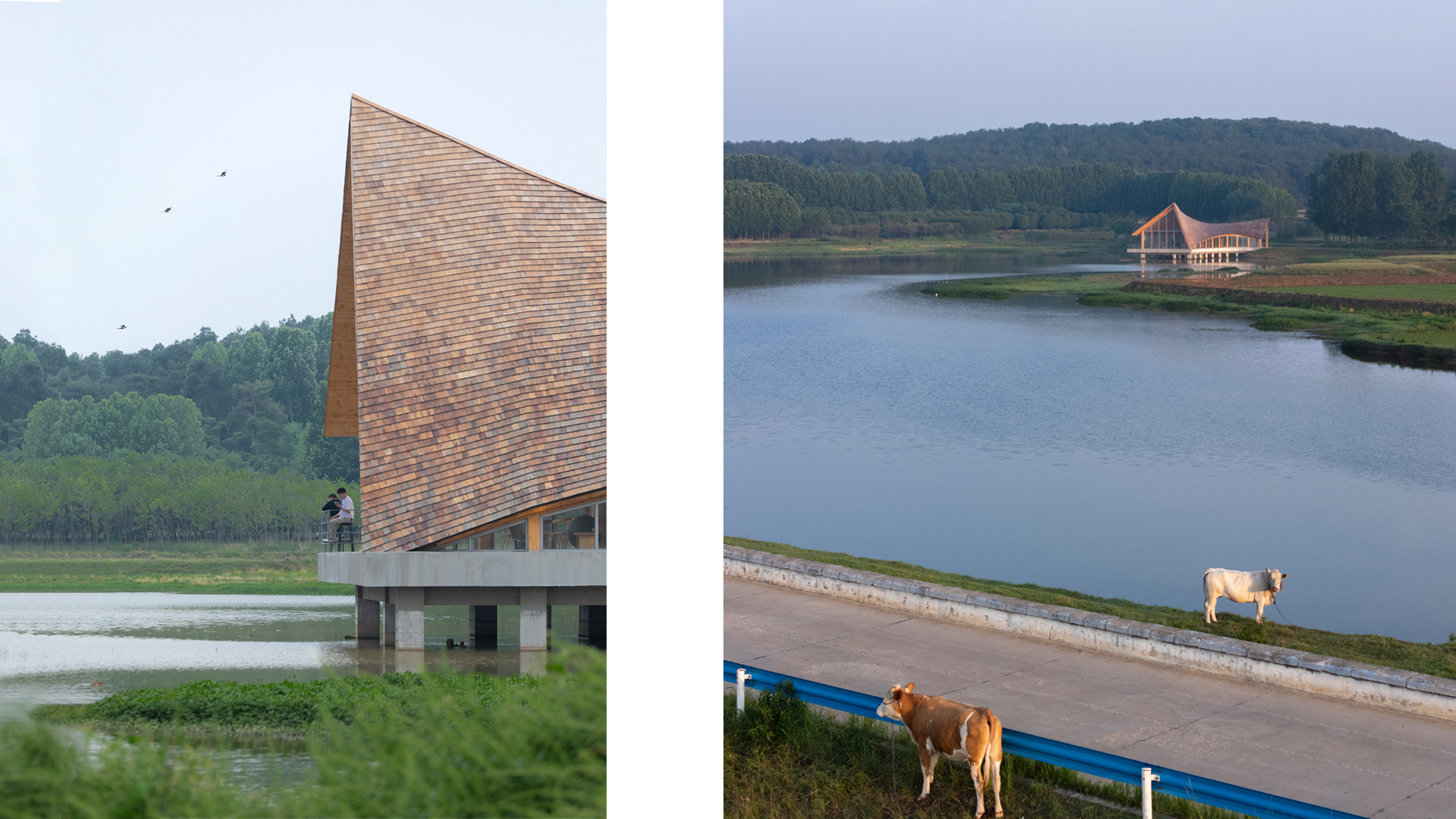 项目所在水库承担着周边农田灌溉功能,水位随季节变化。考虑到水库周边丰富的水鸟栖息环境,设计采用环境敏感型生成逻辑:通过数字化地形分析,使建筑既融入原生堤埂肌理中,又通过抬升基座适应水位波动。原生植物系统被保留为生态缓冲带,形成建筑与水域的有机过渡。