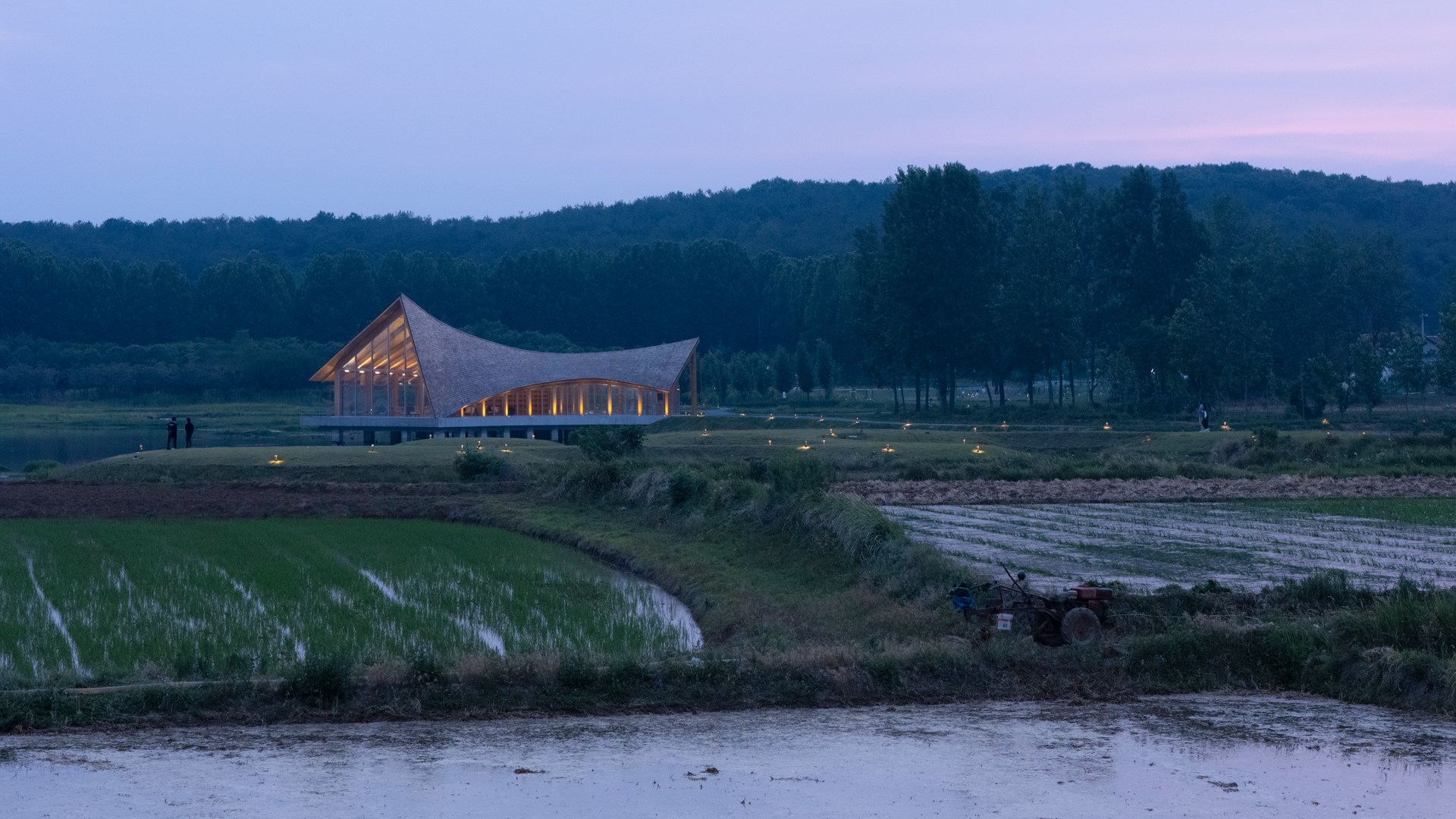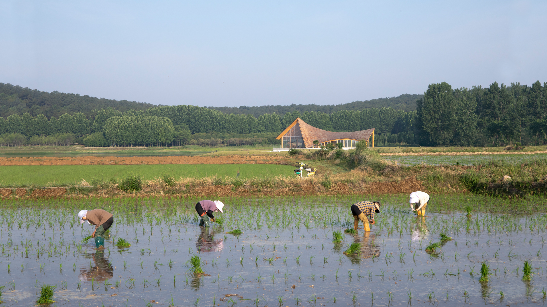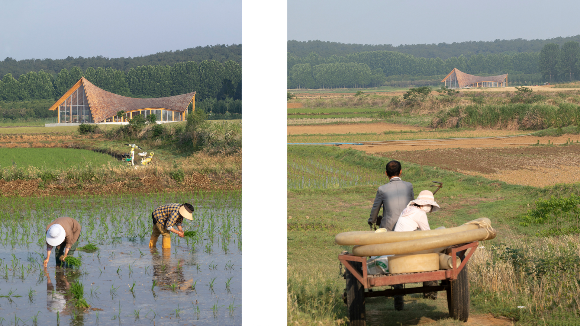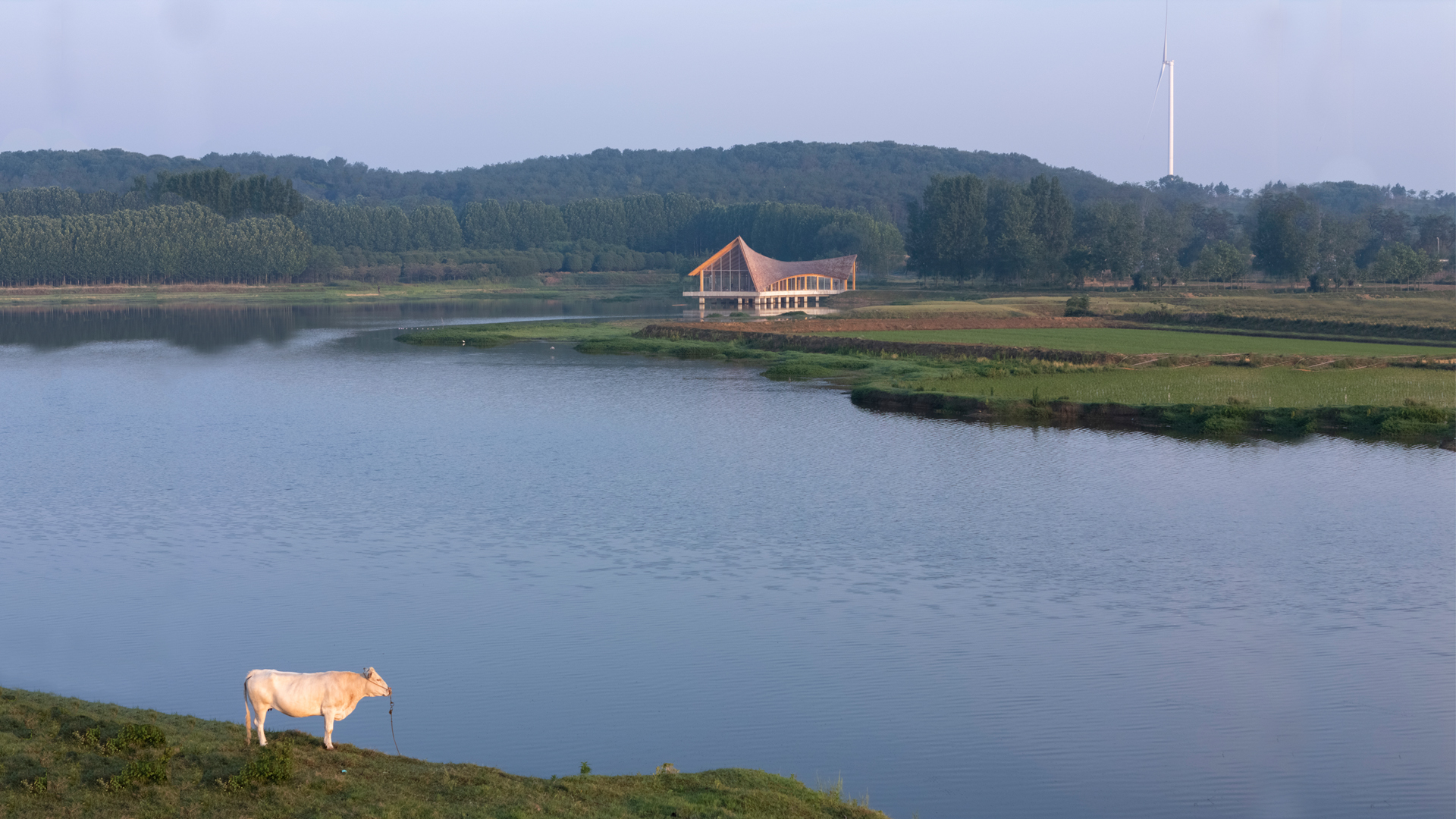 浮舟纪村民中心位于刘岗村水库岸边,作为乡村振兴试点项目,旨在应对当地空心化、老龄化和产业单一等问题。项目场地由大片的水稻田和民居村落环绕,建筑以谦逊姿态融入农田景观,保留原有田埂和原生植物,形体设计从周边环境中提取灵感,与自然风貌和谐呼应。