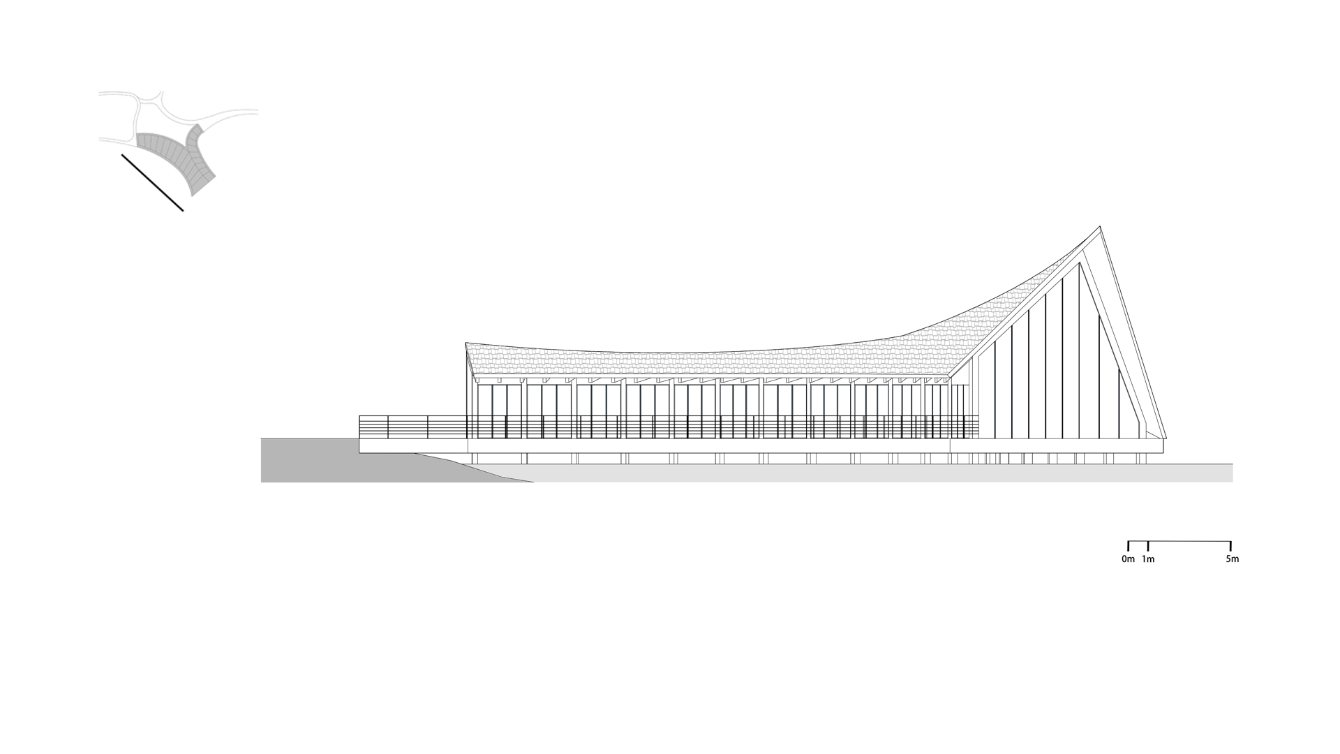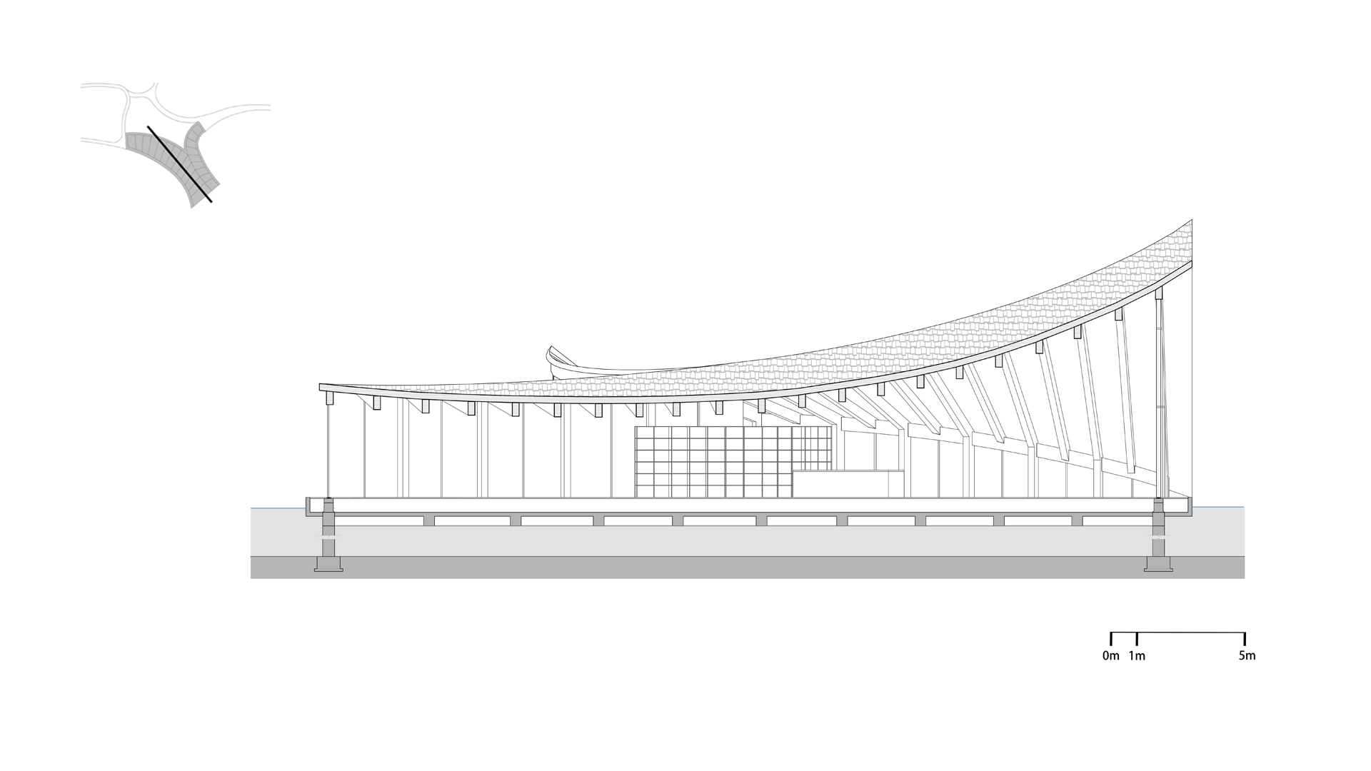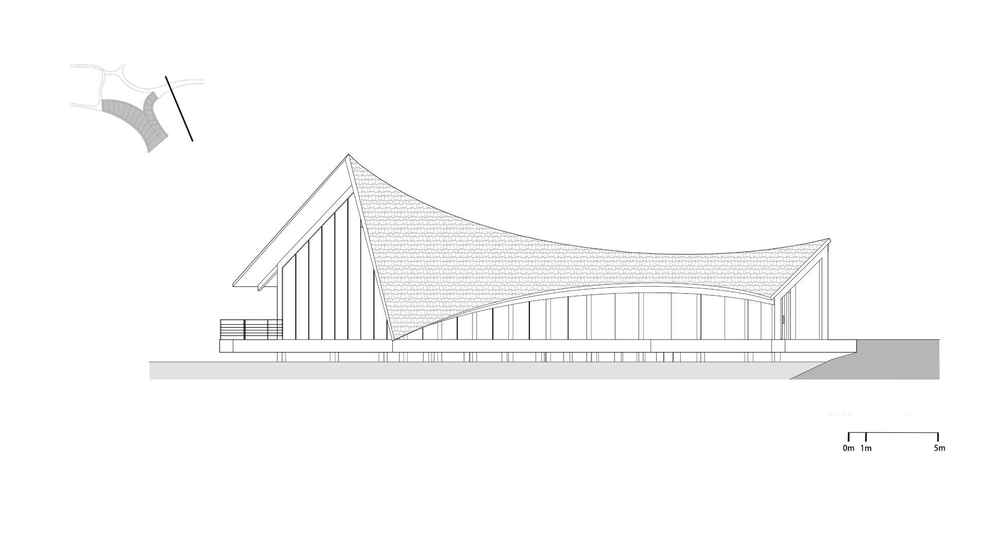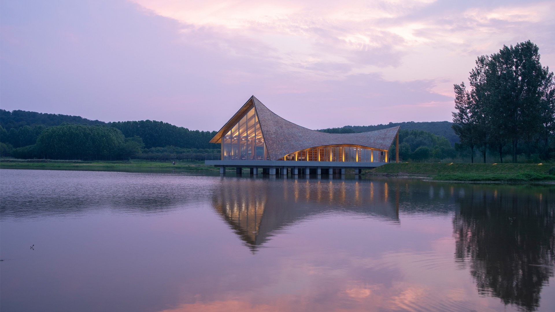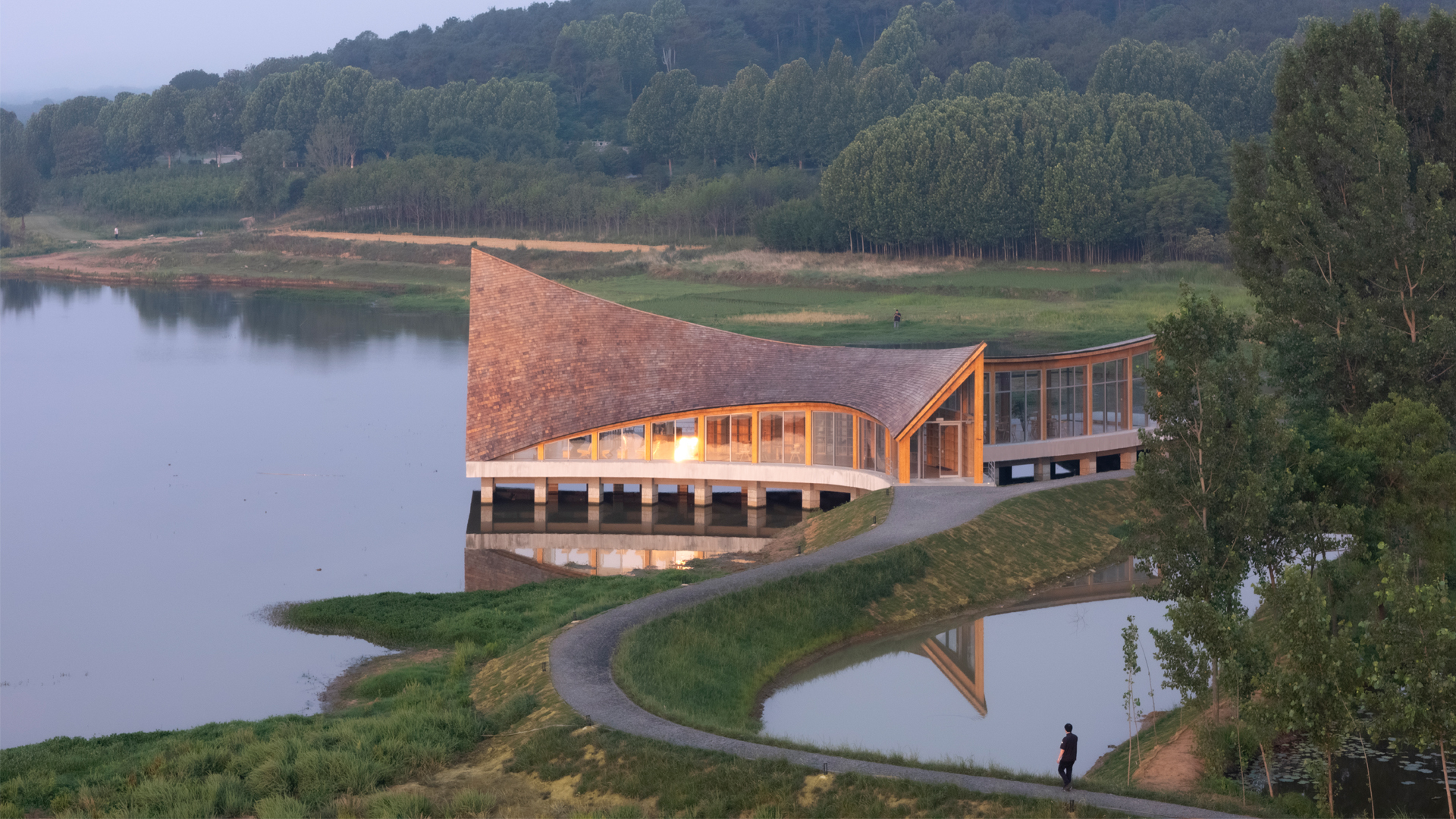 浮舟纪村民中心位于刘岗村水库岸边,作为乡村振兴试点项目,旨在应对当地空心化、老龄化和产业单一等问题。项目场地由大片的水稻田和民居村落环绕,建筑以谦逊姿态融入农田景观,保留原有田埂和原生植物,形体设计从周边环境中提取灵感,与自然风貌和谐呼应。