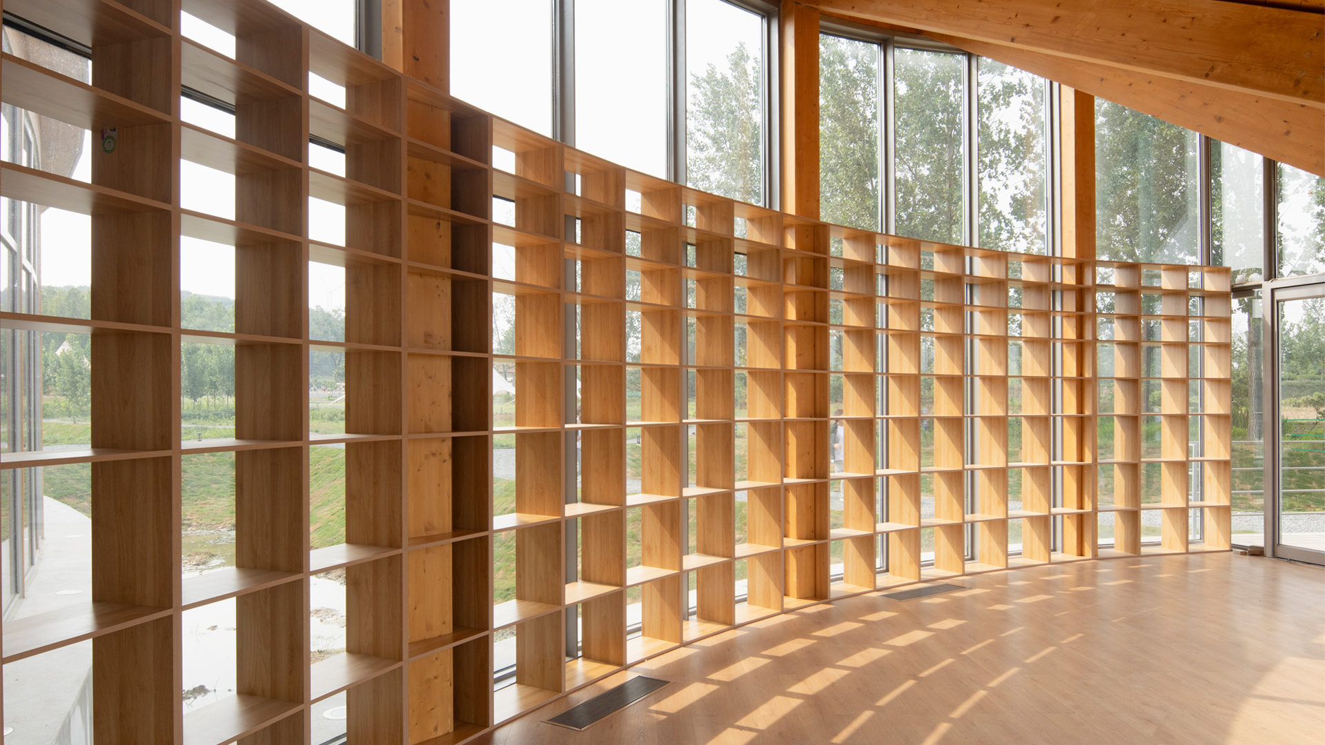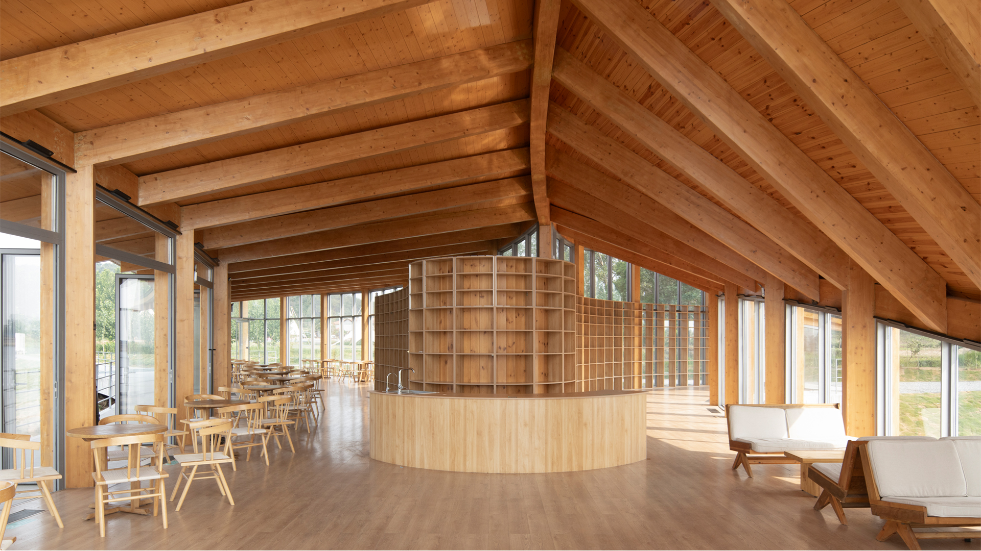 为满足村民需求,中心设置了茶室、儿童图书馆等功能空间,成为村民日常活动的理想场所。建筑运用低碳环保的胶合木与钢节点混合体系,所有双曲面构件通过数字化建模工厂预制,现场采用"木构积木"式精准拼装工艺,显著降低施工对环境的影响。